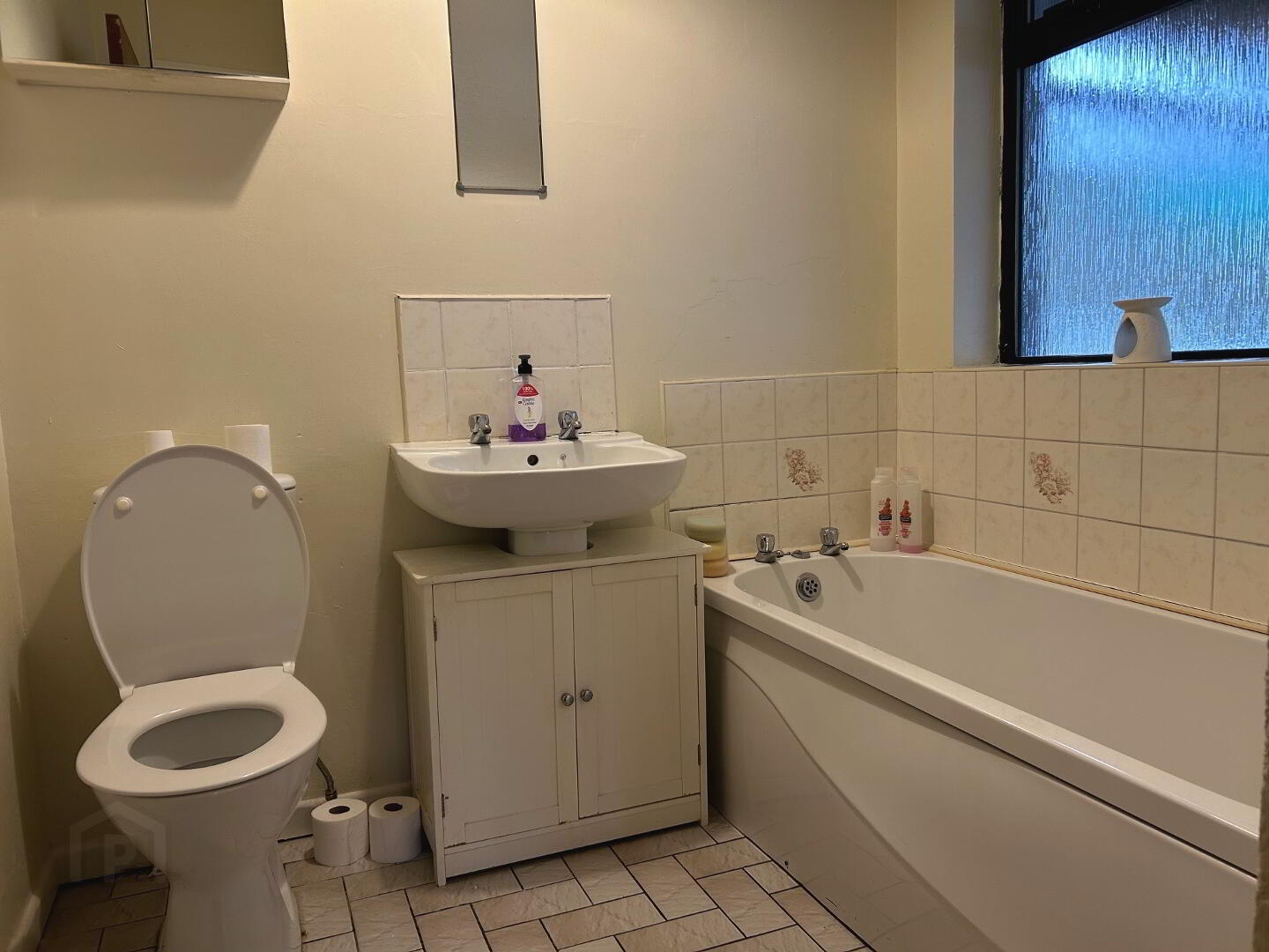 Bathroom - (1.71m x 2m) bath, W.C., W.H.B., splash back tiling to bath and W.H.B., tiled floor.