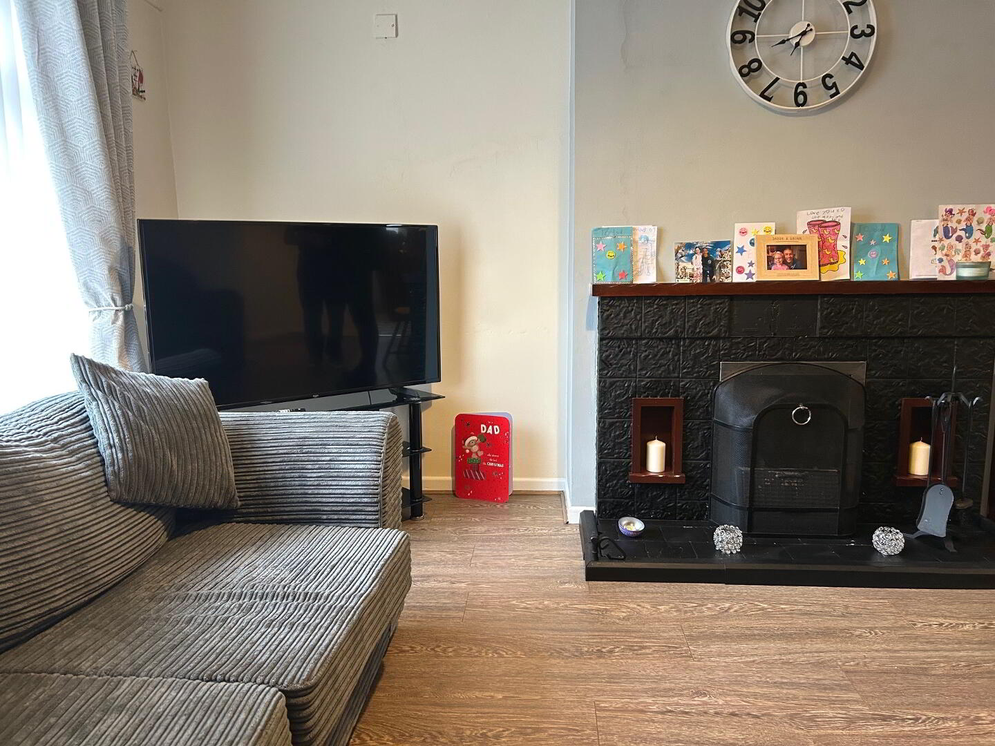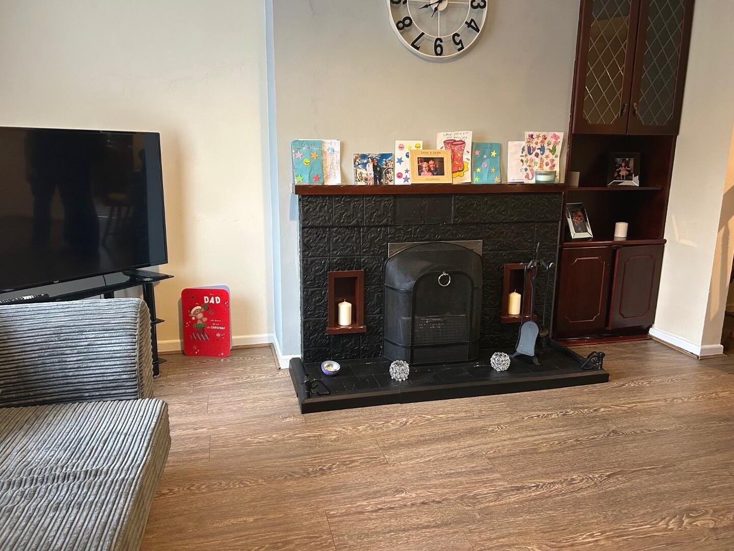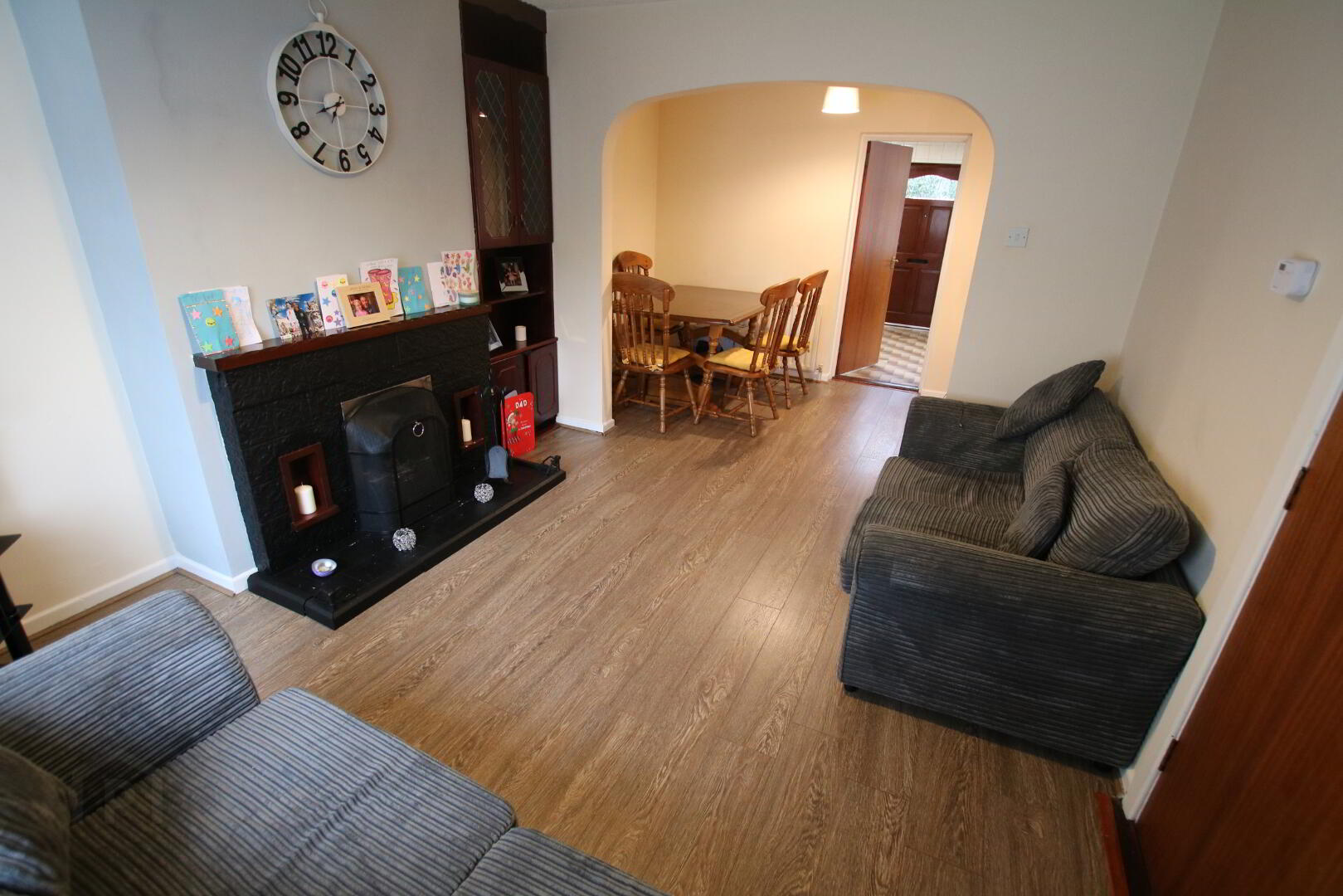 Open plan living room/ dining room - (6.13m x 3.47m) laminate flooring, open fireplace with tiled hearth, back boiler, built-in glazed display cupboard.