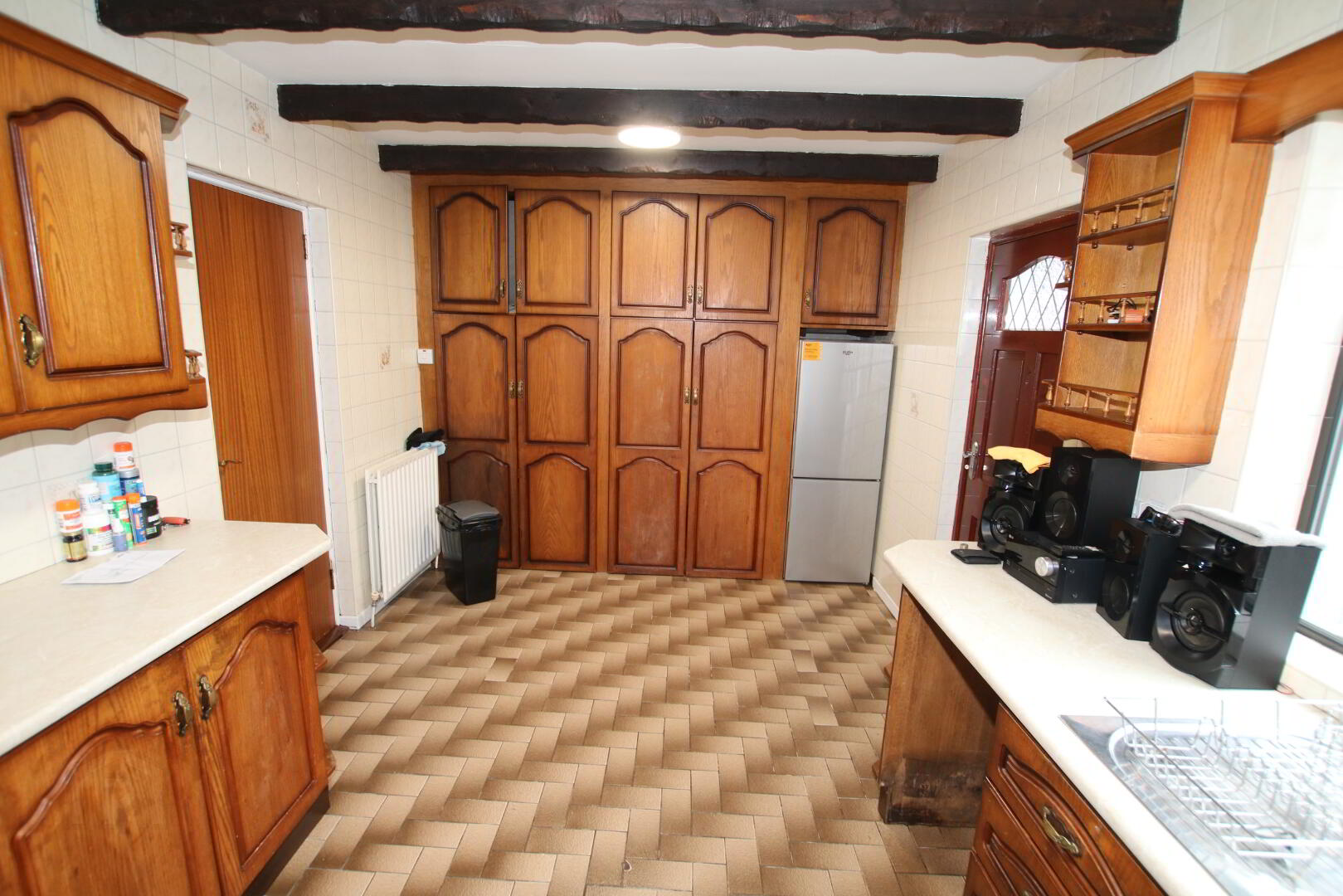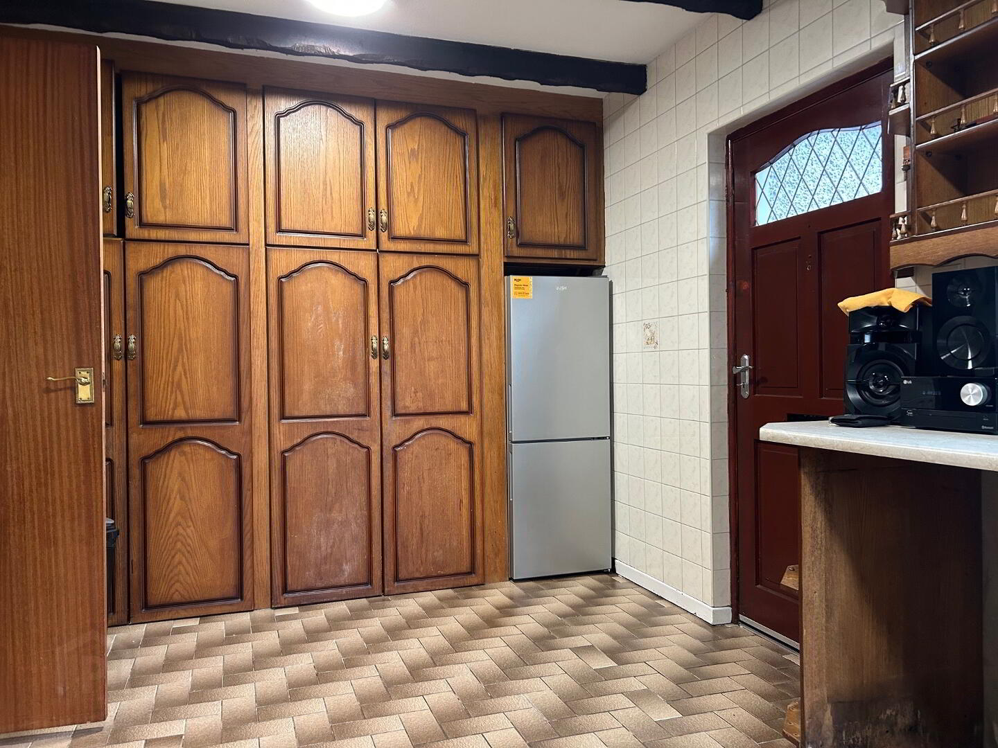 Kitchen - (2.86m x 5.39m) large range of high and low level units, glazed display units, s/s bowl and half with drainer, space for washing machine, cooker and fridge freezer, tiled floor, tiled between units, floor to ceiling wall units and built-in hotpress.