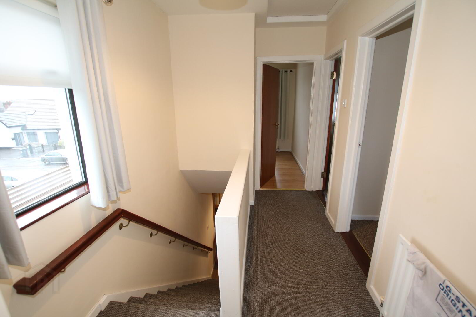 Landing with carpet flooring and access to attic space