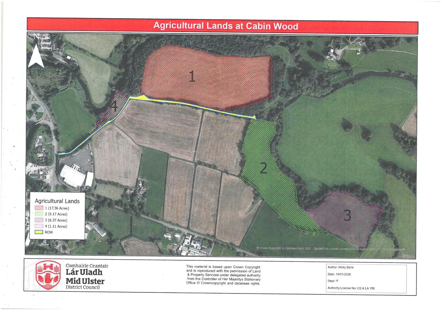 On Behalf of Mid Ulster District Council Approximately 34 acres of agricultural land to let at Cabinwood, Cookstown 3 year conacre agreement with option of two further one year periods All offers to our office immediately, CLOSING DATE MONDAY 16th FEB 2026, no new bidders after 12 noon. For viewing arrangements, please telephone our office. For cutting and grazing, Water supply to some of the fields Hardcore laneway and parking area must be maintained approx 3 times year and undertake basic repairs as required No subletting or assigning Access will be required by Mid Ulster District Council or others for purposes such as site surveys and inspections Hedge boundaries to be maintained annually