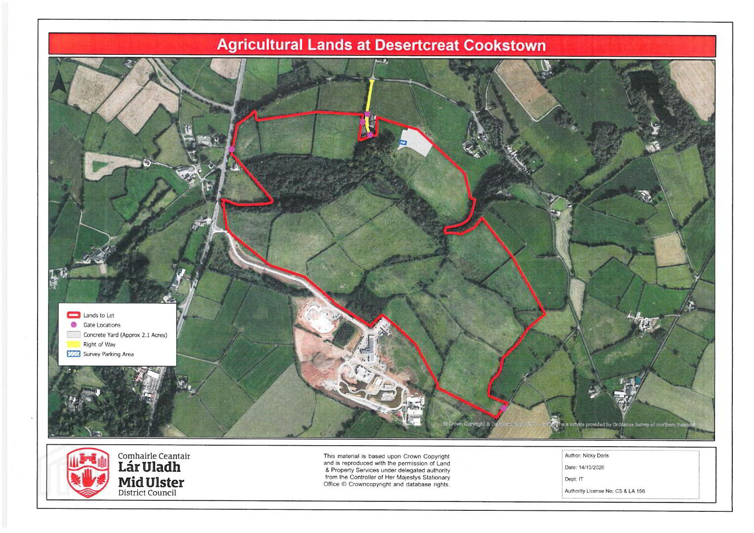 On behalf of Mid Ulster District Council Approx 148 acres of land to let at Desertcreat, Cookstown Made up of approximately 148 acres of agricultural land, and substantial concrete yard. Intersected by Killymoon River, over which a bridge is built 3 year conacre agreement - lands to be reseeded and left in grass at end of letting period Option of two further one year periods Lands adjacent to the new NI Fire & Rescue College Access will be required by Mid Ulster District Council or others for purposes such as site surveys and inspections Laneway must be kept clean and unobstructed at all times Hedge boundaries to be maintained annually All offers to our office immediately, CLOSING DATE MONDAY 16th FEB 2026, no new bidders after 12 noon. For viewing arrangements please phone our office OPEN TO OFFERS